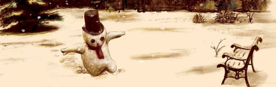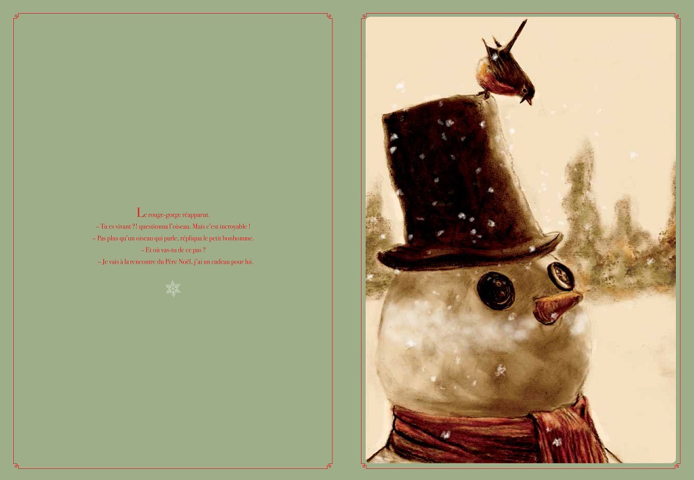 Sur la couverture de ce grand album, un bonhomme de neige, souriant, marche d’un pas volontaire avec un chapeau sur la tête, une écharpe autour du cou et un baluchon au bout d’un bâton. Vers où, vers qui, pourquoi ? Il va en Laponie voir le Père Noël pour lui offrir un cadeau…
