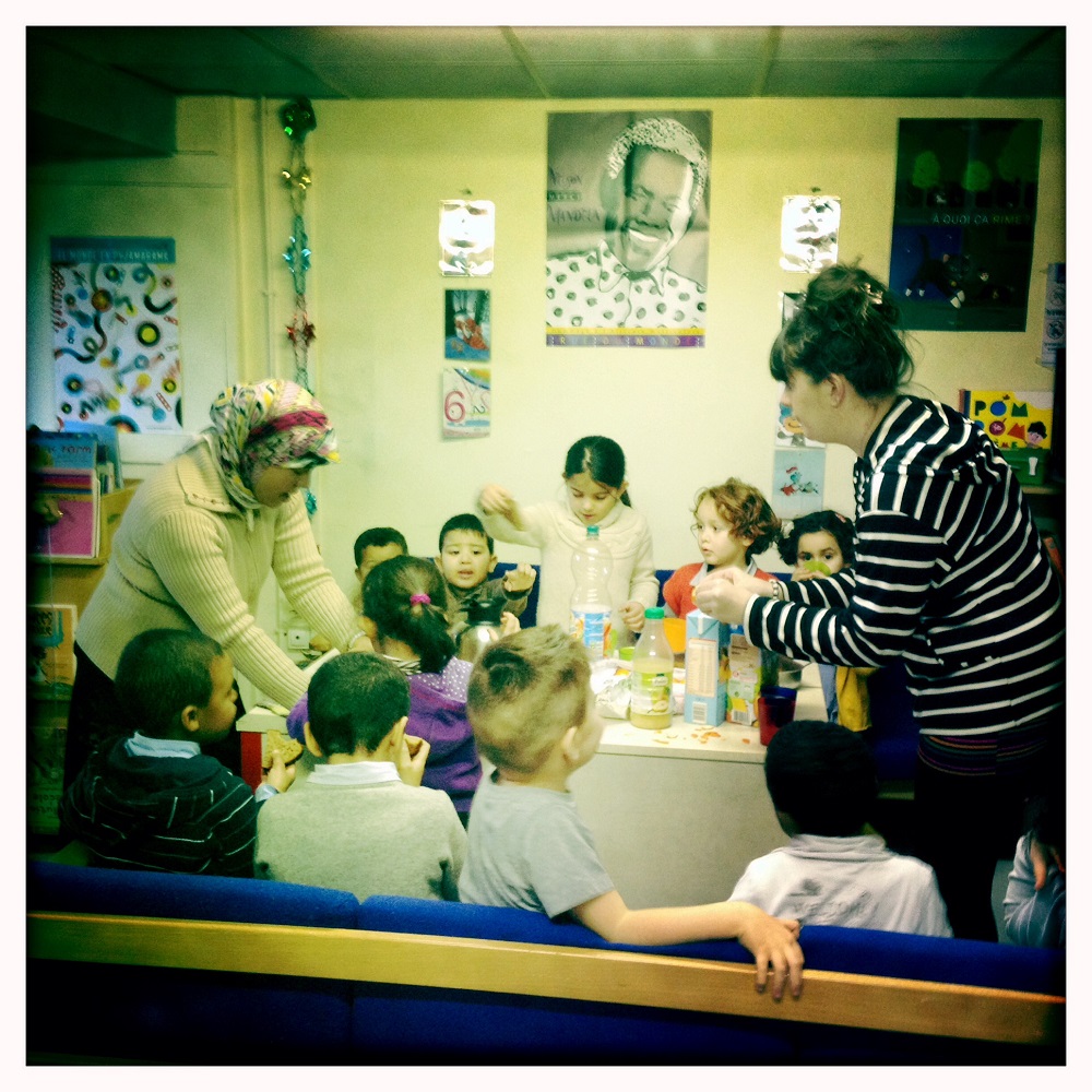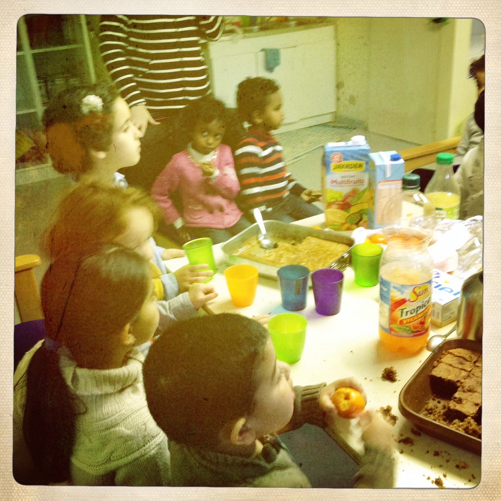 Goûter. Je lis Le voyage d’Anoki pour finir. Puis je sens que la limite de leur concentration est atteinte. En attendant l’heure du goûter, les enfants se mettent à faire des puzzles en groupes dans chaque coin de la pièce. Ils sont concentrés. Le calme avant la tempête. Quand arrivent boissons et gâteaux, il est temps pour eux de se lâcher. Ils l’ont bien mérité ! Moi, je me jette sur le thé pour réhydrater ma gorge asséchée !