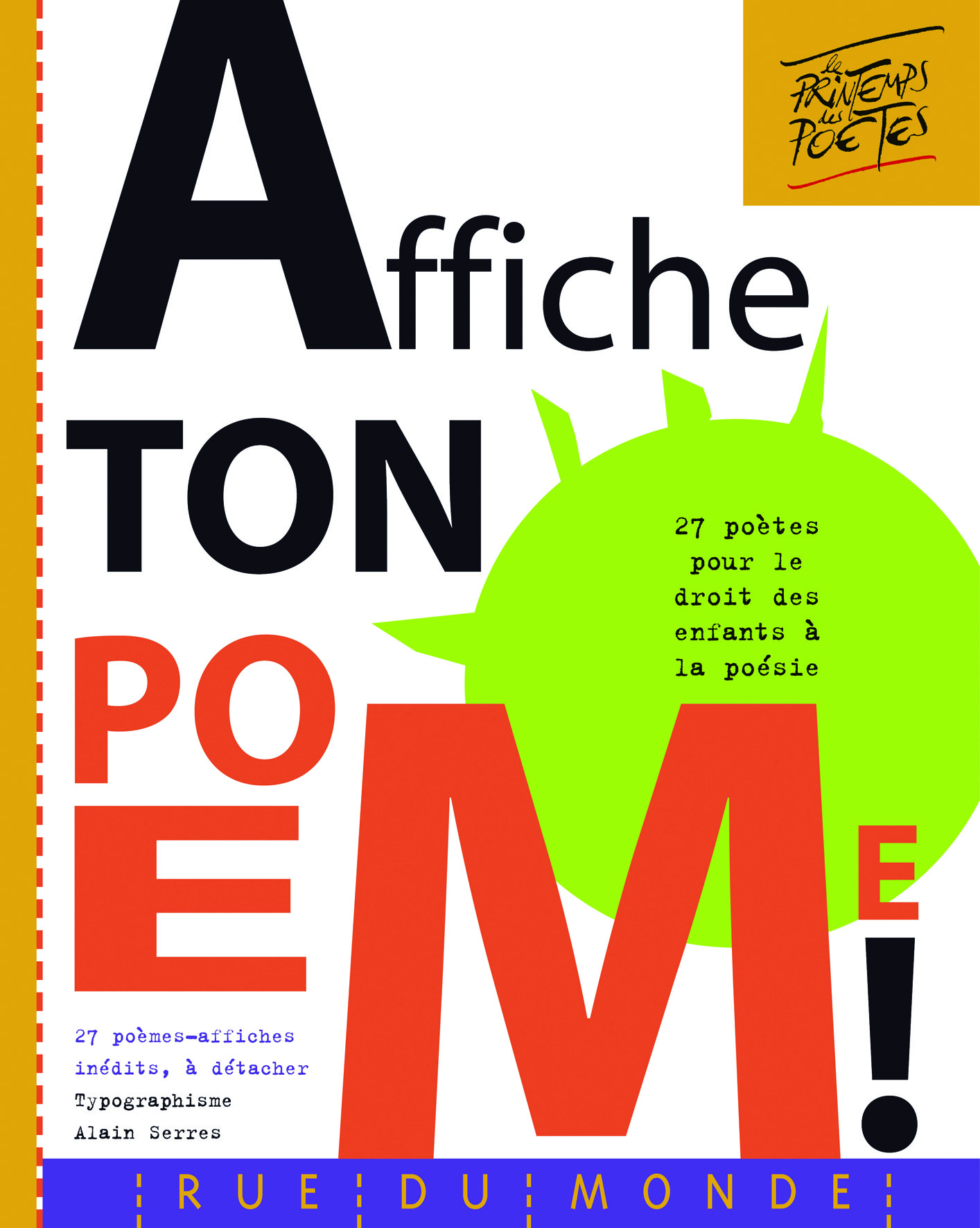 Cet album grand format propose une lecture graphique et typographique de textes courts de 27 grands noms de la poésie contemporaine. Mais ce n’est pas tout, chaque feuillet peut se détacher et s’afficher pour semer de la poésie sur tous les murs de la cité. Une chouette idée signée Alain Serres dont l’inventivité revigore et invite les enfants à en faire autant et bien au-delà du 23 mars. Mercredi, c’est sûr, il y en aura à TAKAlire ! (Rue du monde, 64 pages, 20,20 €. Pour tous.)